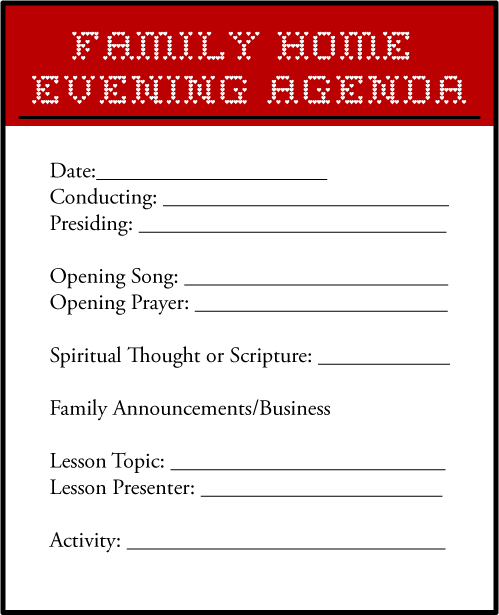 This is a family Home Evening agenda form you can use to help conduct and plan your FHE activities.