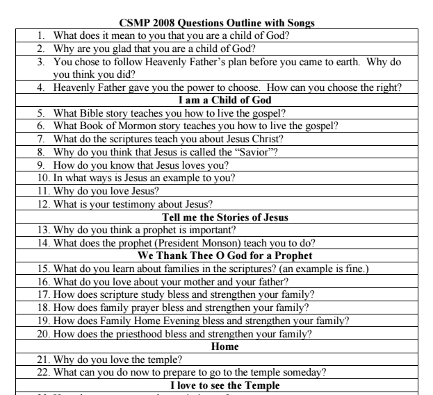 You can use this document by Stephanie Sorenson to get ideas of what questions to ask children to help you plan the Children’s Sacrament Meeting Program.