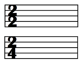 Next, you need to understand a time signature. The time signature is found at the beginning of each song. It looks like a fraction. In order to direct music, you will only need to understand the top number. It shows how many beats are in each measure. The two time signatures below, for example, each have two beats per measure.