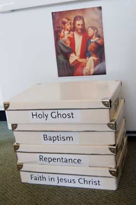 The song our Primary has chosen to sing for May is “The Fourth Article of Faith.” To begin we will discuss the meaning of the words “principles” and “ordinances”, then do a fill-in-the-blank game. I’ll then uncover my boxes pictured above, and we’ll si…