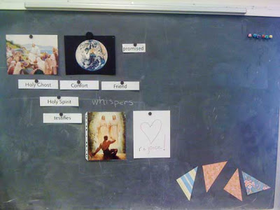 Here is my board setup for today, as we sang both verses of “The Holy Ghost” (CS 105). We completed building our little comforter with the discovery questions, and sang through the song enough times to be pretty familiar with it. Next week I’ll set the…