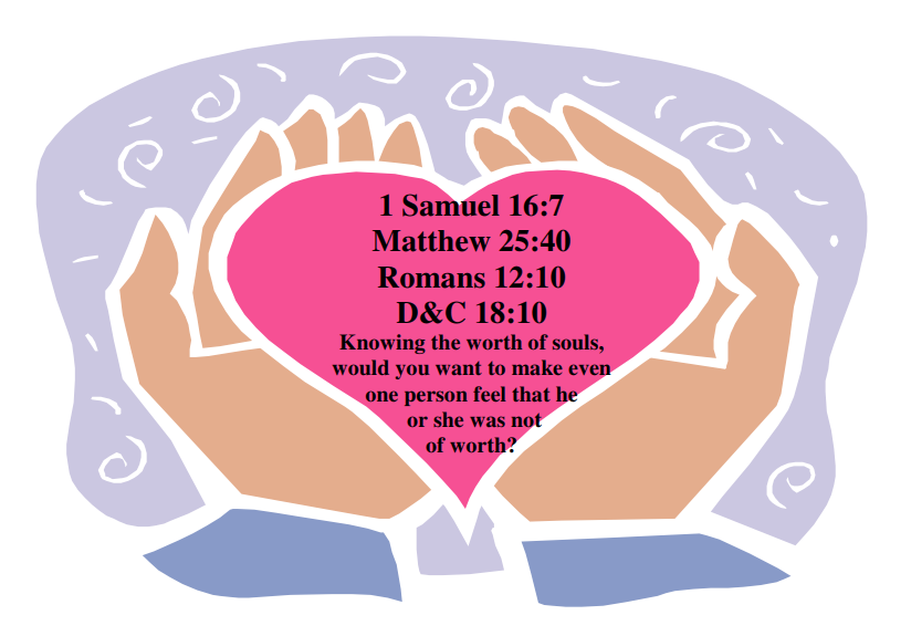 Dear Jenny, I have attached a handout I used for the lesson on each person is divine and eternal. The graphics are from microsoft word. I hope this makes someone elses handout easier than starting from scratch. Thanks, Laura R 1 Samuel 16:7 Matthew 25:40 Romans 12:10 D&C 18:10 Knowing the worth of souls, would you want to make even one person feel that he or she was not of…