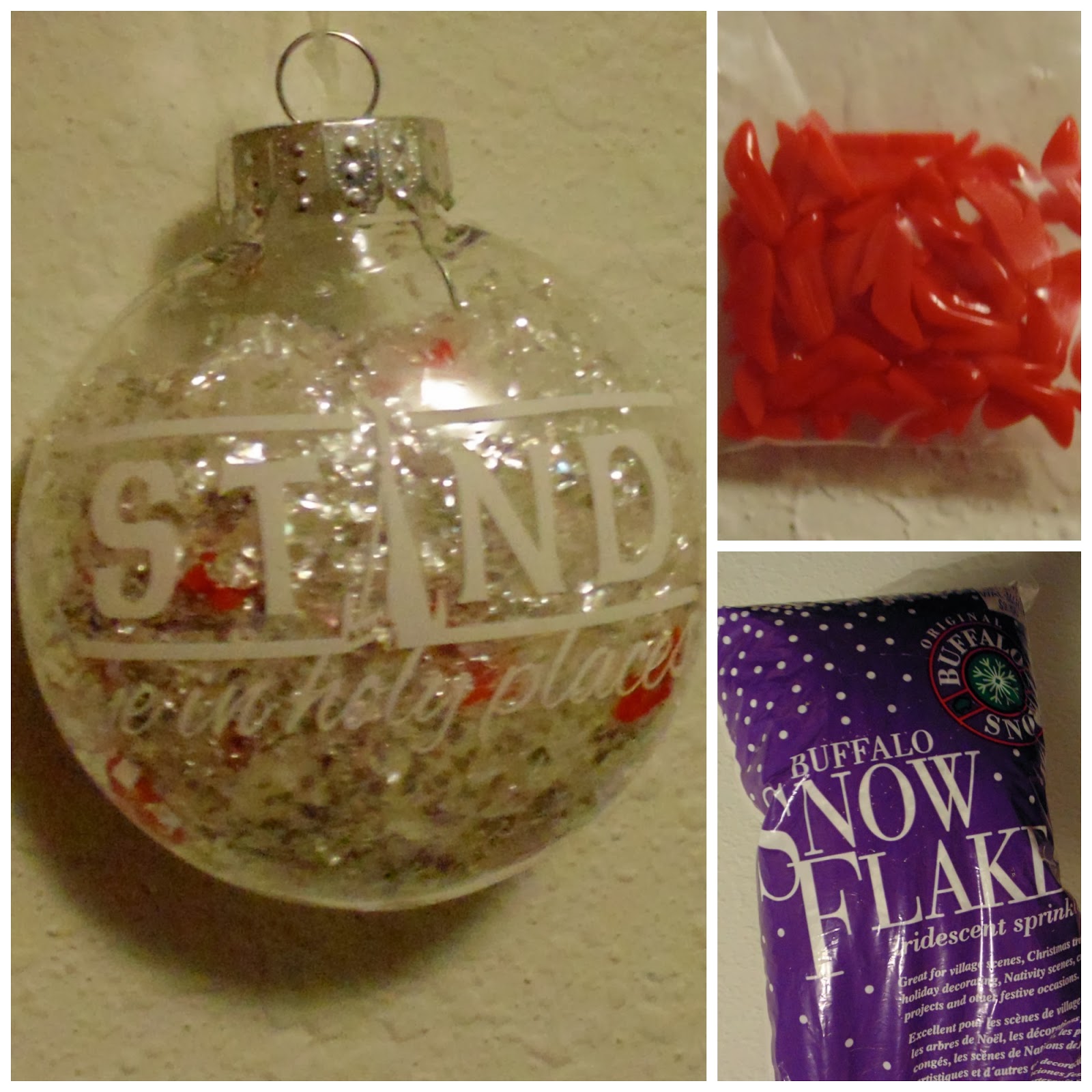 You can leave these as-is, or if you use fill-able ornaments, you can fill them with an item that goes along with the annual theme. For “Stand ye in Holy Places” I bought tiny red shoes to go inside (along with some filler). I got my red shoes from RockinResin on Etsy here. You can’t see the shoes well in the ornament photo because of the glare, but it is really cute in person.