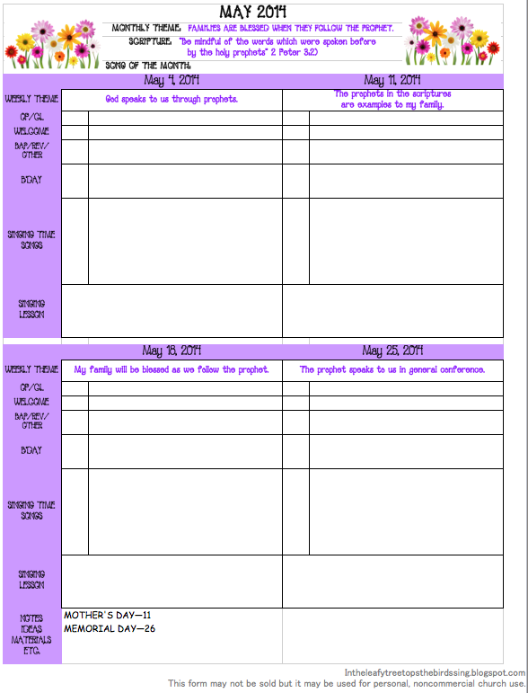I have had requests asking if I would be posting a Music Planner for 2014. Hadn’t thought about it so I guess I wasn’t really planning on it, but got in a bit of a mood today to get some planning done for Primary next year and was perusing the outline and before I knew it, I was on my way filling the Music Planner out. My brain started to churn with ideas as I was reading the outline and I had to keep reminding myself I wasn’t in this calling anymore. Old habits die hard. Actually, the music leader that replaced me wasn’t in very long since she ended up getting married (excited for her) so a new music leader was called a couple of months ago. She is doing a fantastic job and it is so great to see the kids connecting with her. Makes me feel great after the wonderful relationship I developed with the children when I was put in and all the hard work over the years in getting the kids to love to sing (they did not like to sing when I was first called, especially the boys, now the boys love to sing—didn’t help either that we were just divided when I was first called and our new ward was a melting pot from the various wards) that they are continuing to love singing with the new music leader and she does enjoy the time with them. It is nice knowing the kids are continuing to be taken care of. Makes me miss it though.