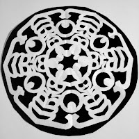 To make these snowflakes, download the document below. Fold along the grey lines, first diagonally in half, then diagonally into fourths, and finally fold each fourth into thirds. Be sure that the folds line up as closely as possible. Precise folding is far more important than precise cutting.