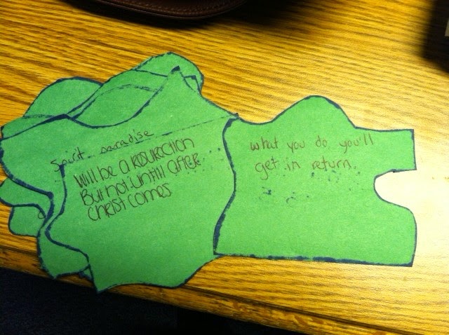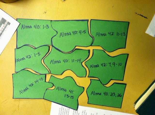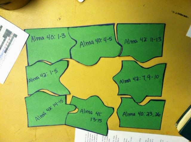 I broke them up into two groups for this activity. I made up my own pattern for a puzzle. On each piece I wrote a scripture verse from Alma 40-42 that related to the spirit world and the Resurrection.Then I put them in a baggie.