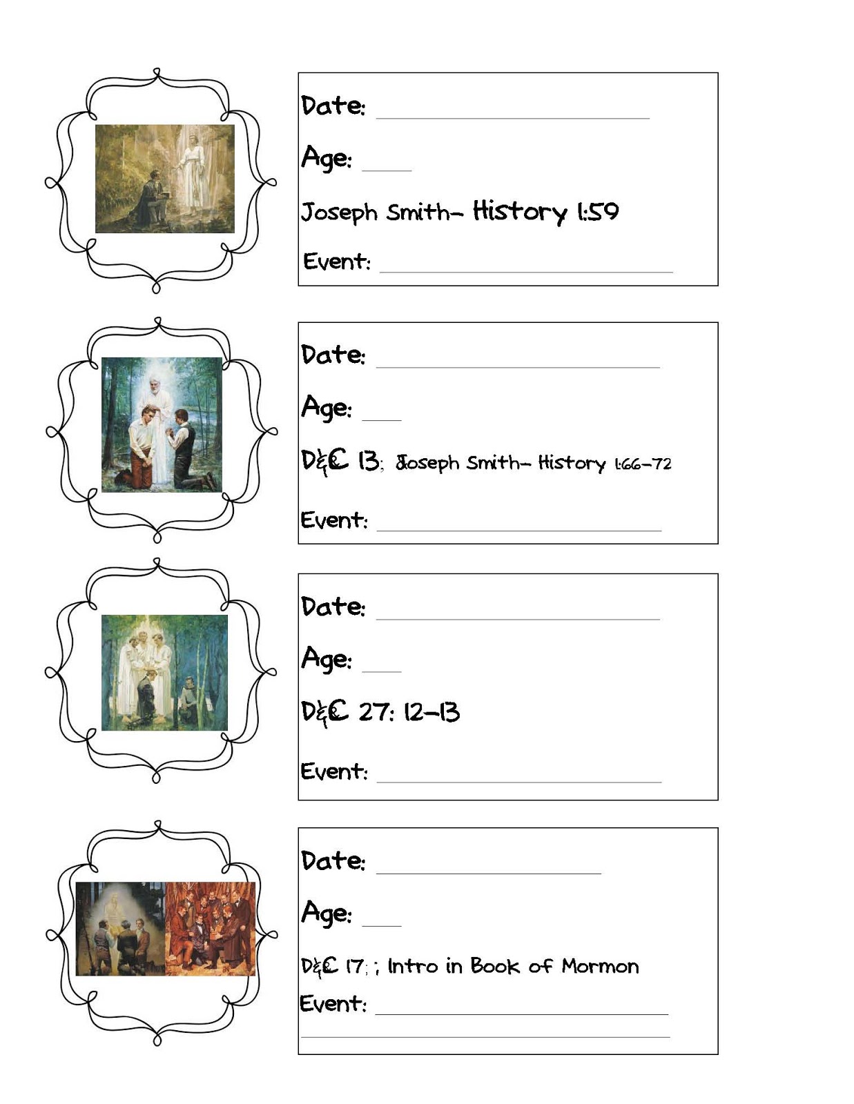 I called and am having a YW come prepared with details to each of these events.  This way we are not reading the verses in class and they can be involved in teaching the lesson.You can find out age and date info on lds.org.  I just googled “Joseph Smith Timeline” and it came up as an option.