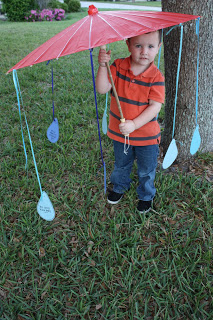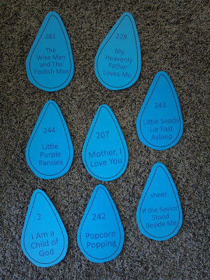 Hang paper raindrops from an umbrella. Put song names on the rain drops. When a child picks a raindrop put in on the board in a circular motion and it will become petals of a flower (on a stem already taped on the board). Bring a spray bottle filled with water and if the children are singing well make it rain on them!