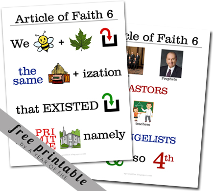This year our Primary has been challenged to learn all 13 Articles of Faith. I learned these (up to Article 6) when I was young, but have never memorized the entire set. Our family is going to work on it together.