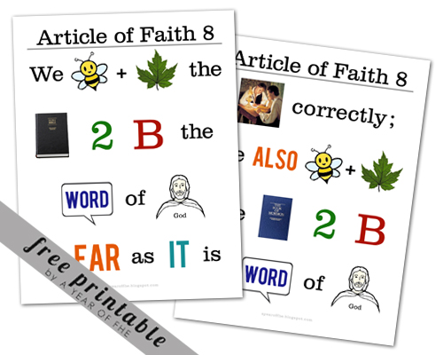 This year our Primary has been challenged to learn all 13 Articles of Faith. I learned these (up to Article 6) when I was young, but have never memorized the entire set. Our family is going to work on it together.