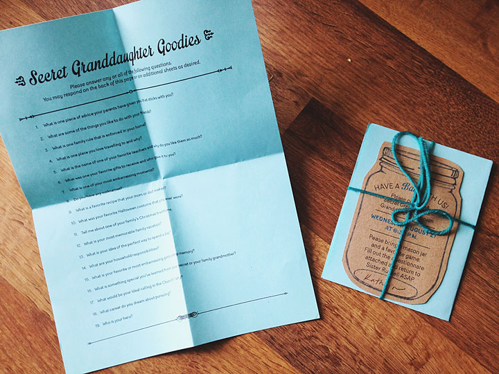 The jar invite was placed on top of a questionnaire, the answers to which would be read the evening of the activity. Prizes were given to girls and grandmothers that could identify whose answers were being read.