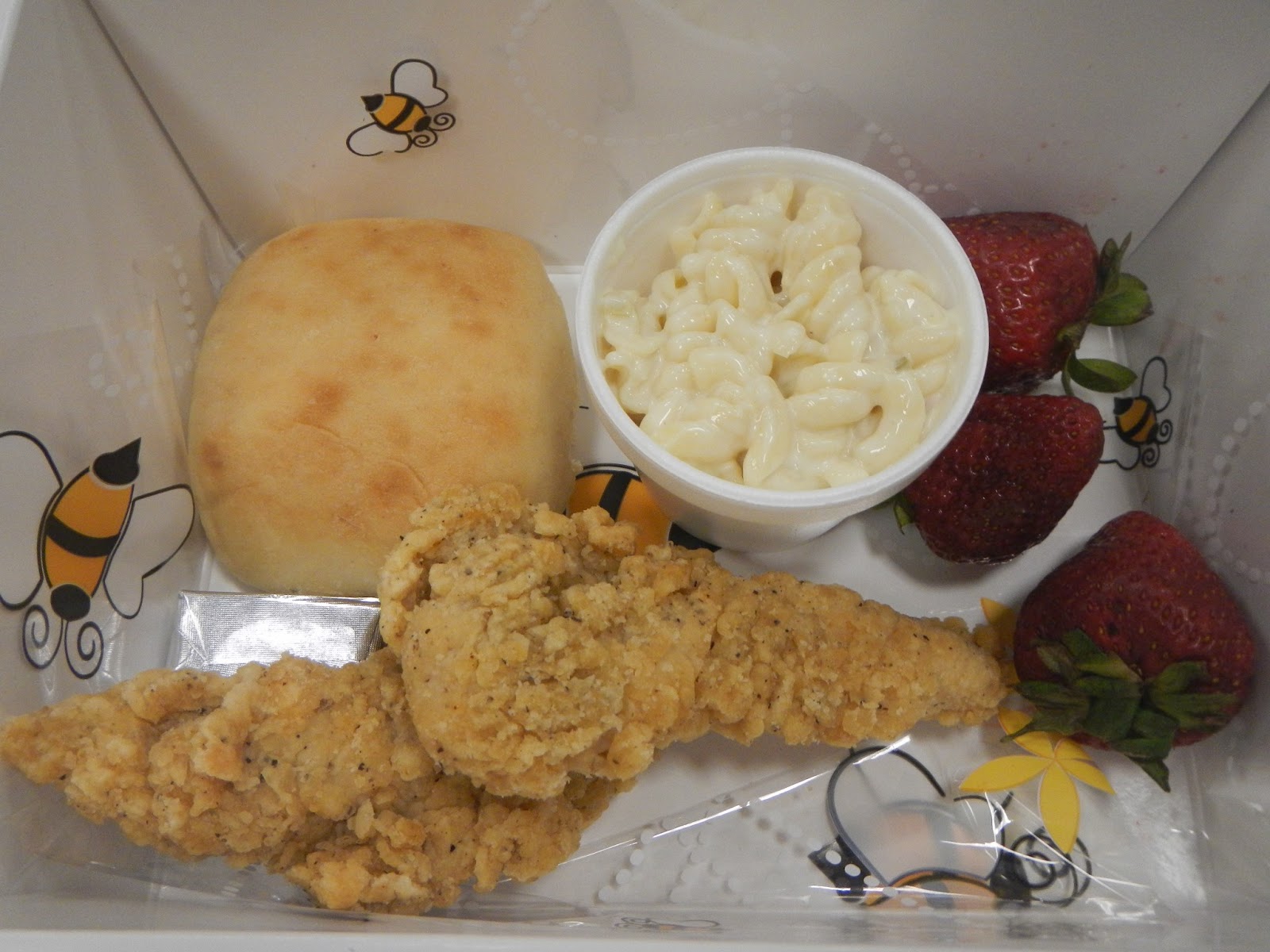 Boxed Dinner: Chicken Fingers, Pasta Salad, Roll, Strawberries, Beehive Cupcake