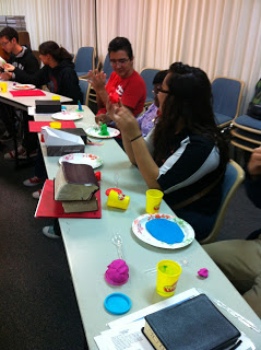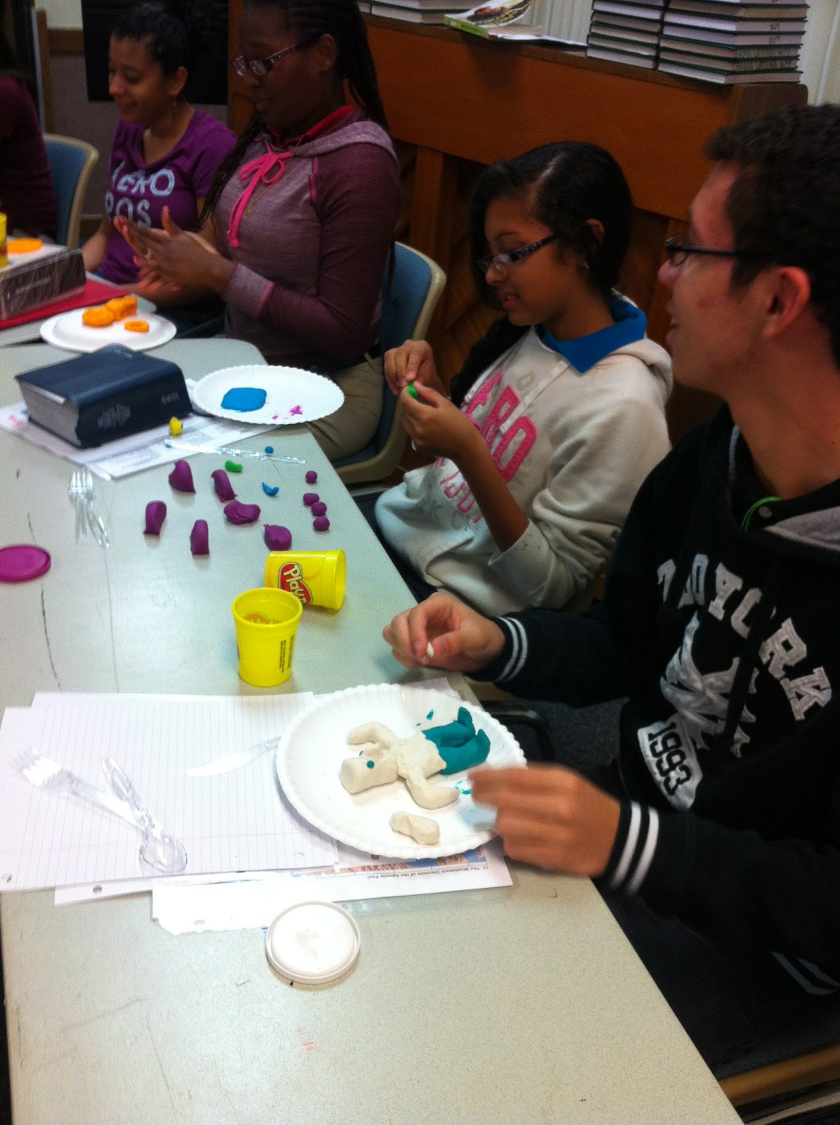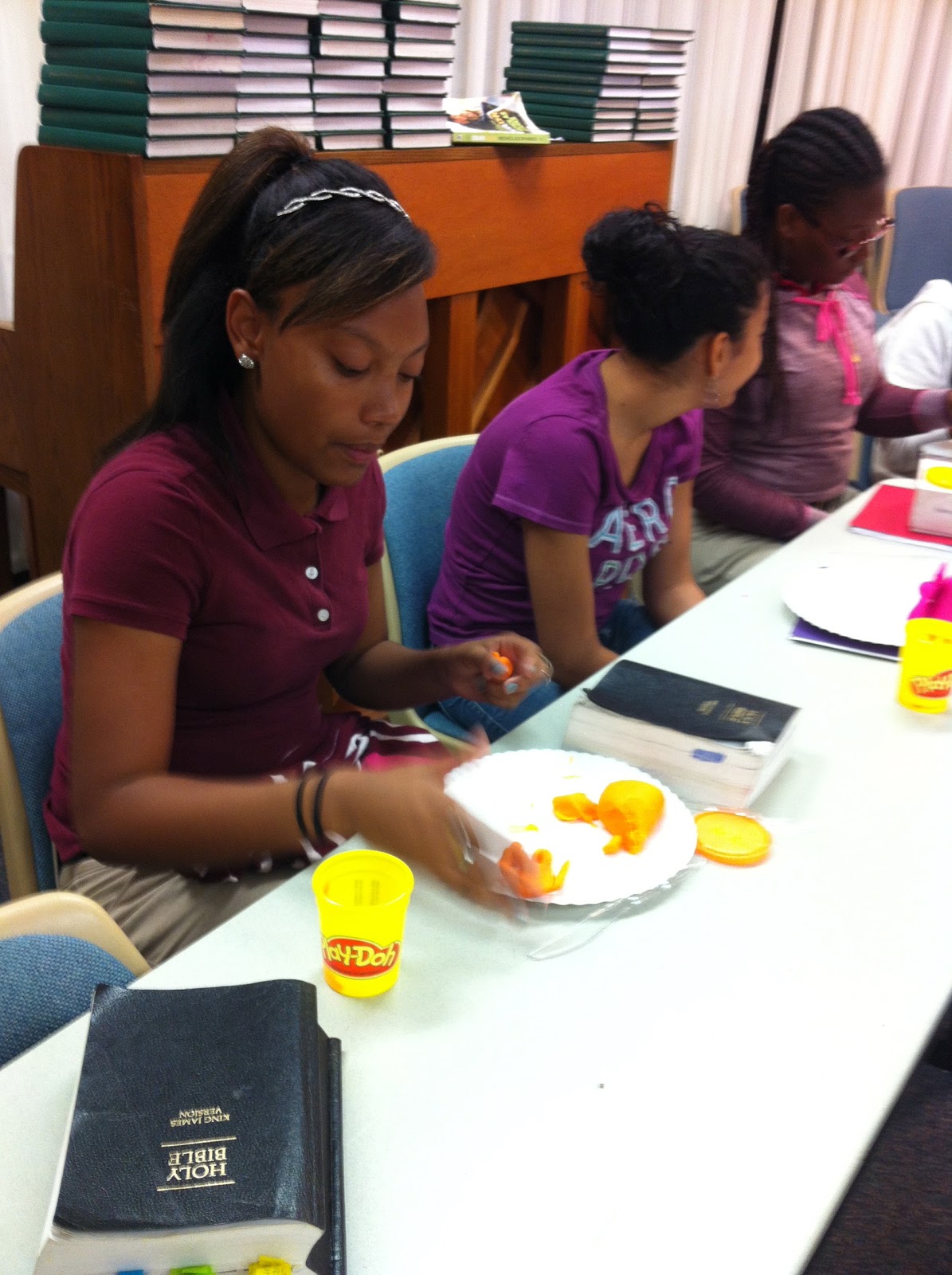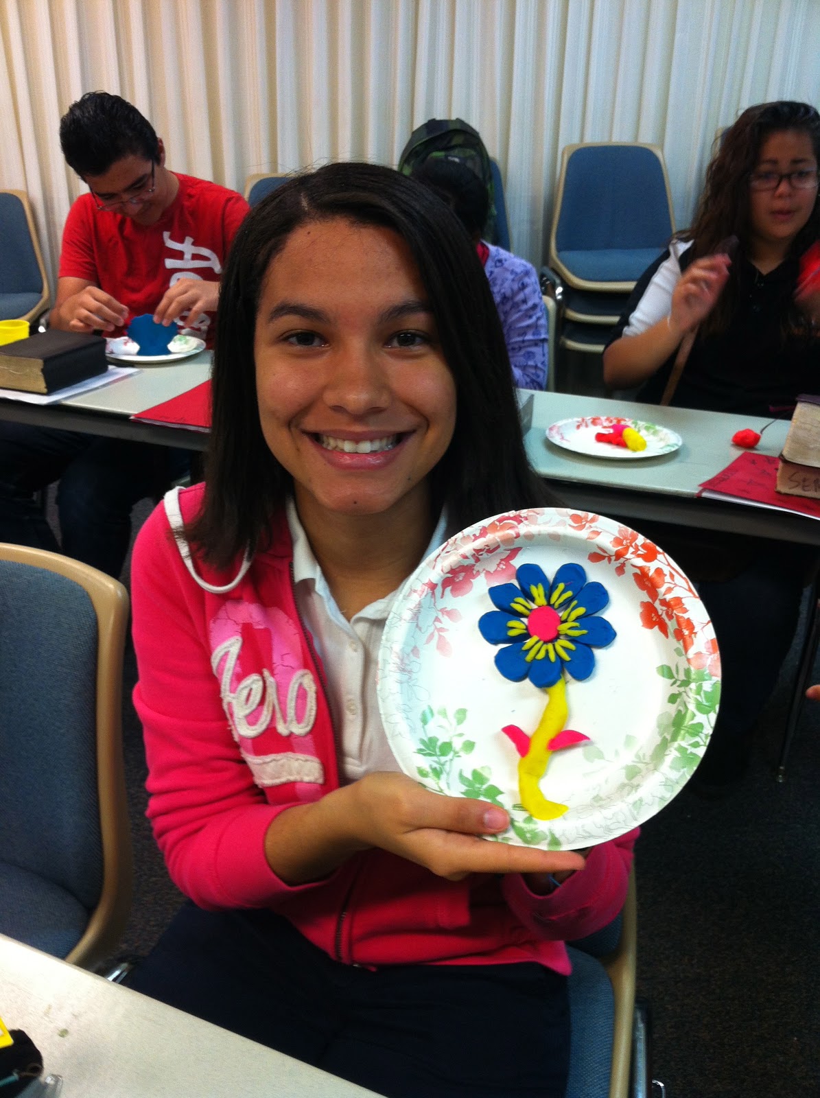Thanks to my Seminary Friend, Pam, I remembered to break out the Playdough for today’s lesson. I have had several ideas for using Playdough and this worked very well. I used store-bought Playdough as I knew the kids would want a variety of colors, but making the Playdough would have been a fun option, also. Make sure you have tools for them to work with. I gave everyone a plastic knife, fork, and spoon. With 20+ students, I did not have enough tools for everyone to have their own rolling pin, etc., but bring an assortment of kitchen gadgets and their creativity will do the rest.