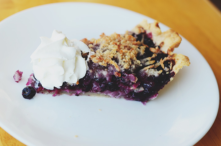 Spread the coconut filling evenly across the bottom of the pie. Top with the blueberries and their juices. Remove the topping from the fridge and use a fork to break it into small pieces. Scatter these pieces over the top of the pie. Bake the pie for 40-45 minutes, until crust and topping is golden brown and berries are bubbling.