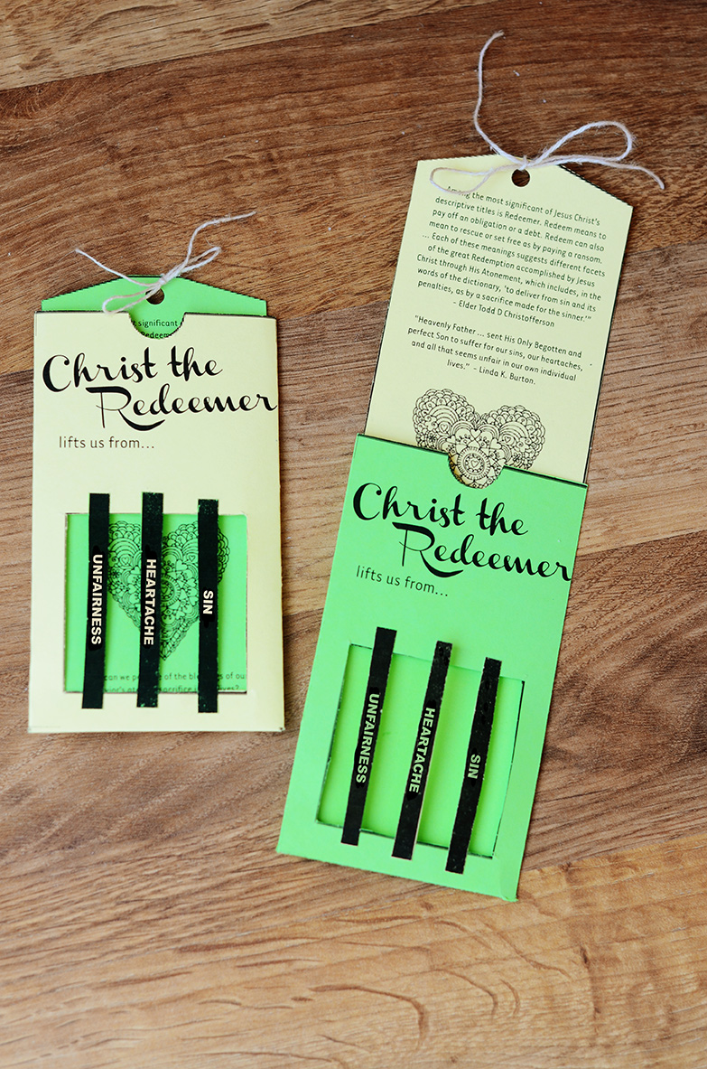 The “bars” on the front of the card are meant to imply that sin, heartache and things that seem unfair in our lives can in a sense, “imprison” us, and that through the redemptive power of Christ’s atonement, we can be rescued or set free.