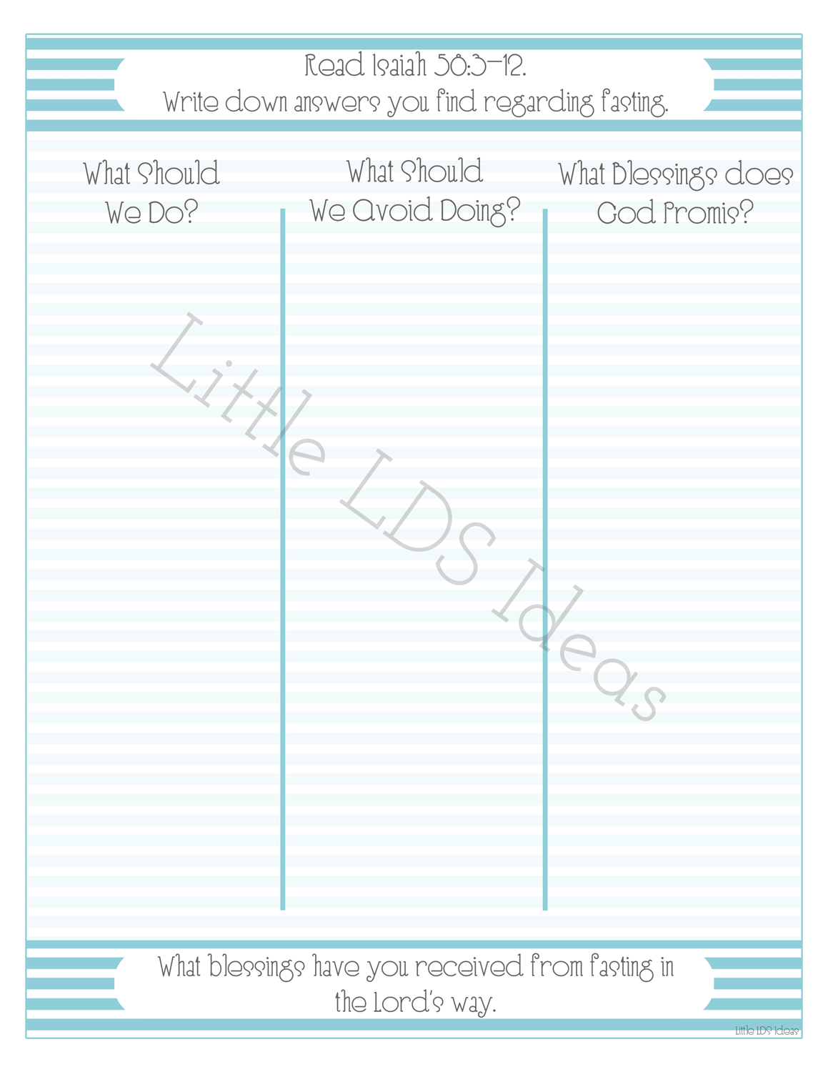 Another part of the lesson asks the girls to make a three-column chart on a piece of paper. The girls are asked to read a scripture and write the different things they read about fasting in the appropriate column.
