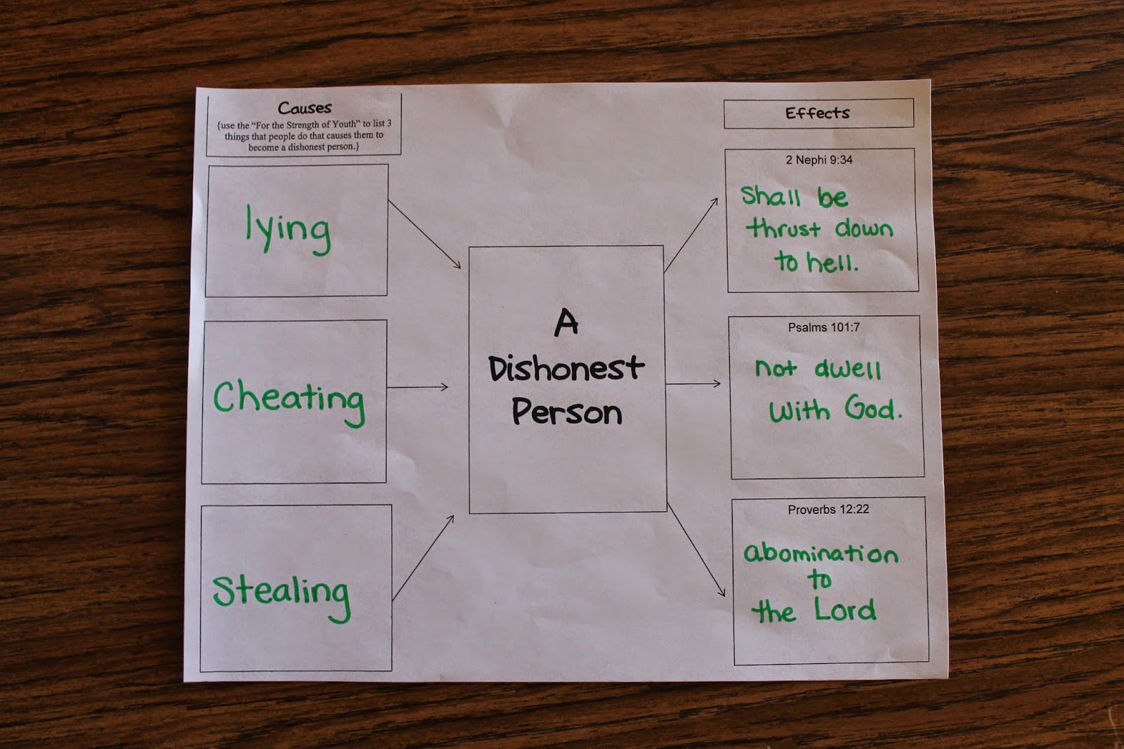 They use the Strength of Youth book to write down the 3 things listed that is not honest. Then, we looked up some of the scriptures in the outline that tell the outcome of a dishonest person. I wanted to stress to them that you should be honest not just because you will be “thrust down to hell” but because it’s the RIGHT THING TO DO! We talked about how you can’t have the companionship of the Holy Ghost if you are dishonest with people. Yes, we talked about repentance too. :)