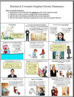As I have talked about in past posts, to learn the Scripture Masteries, it is best to spotlight one scripture a week. BUT you can’t very well scripture chase with only one scripture you have learned. Well the document here (front and back) has all the mnemonics for the D&C. On a “Flexible day” in the Pacing Guide, you may want to go over the first 6 mnemonics and have your students mark them in their scriptures. Once you have gone over 6 mnemonics, have students quiz each other by one saying the key words (at the top of each mnemonic) and the other say the reference. If they can’t say the reference, have the other student give hints from the mnemonic. After a month, do this again with another 6 mnemonics.