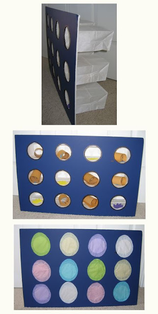 - Cut out 12 egg shapes from the tissue paper. The eggs were each 4 1/2 inches wide and 5 3/4 inches tall. Placed pieces of double sided tape around the outsides edges of the holes and put a tissue egg over each hole.