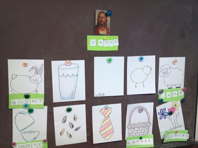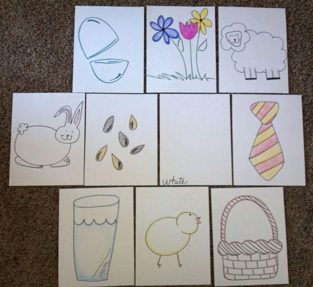 - SR: print symbol word strips, cut up each word, put in eggs, put in basket
