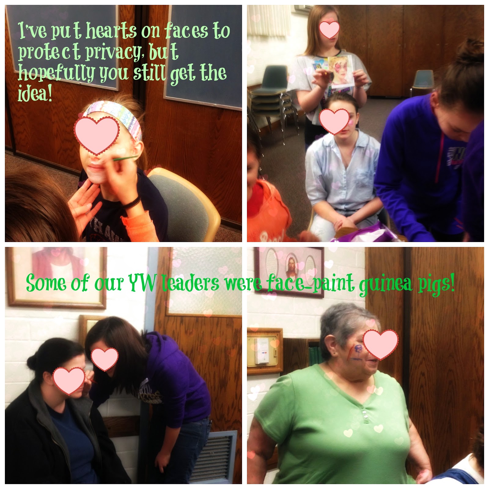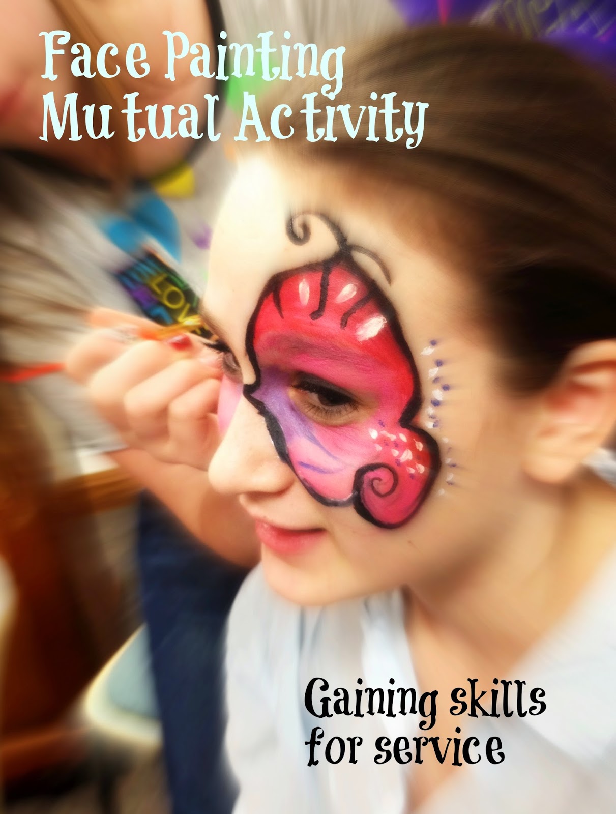 The purpose behind learning how to face-paint was to teach the girls a skill that they may be able to use for service. Whenever we have a ward party (Halloween, 4th of July, etc) the young women usually get asked to make centerpieces for the tables. Which is fine, but I thought it would be so fun if the girls knew how to face-paint and could offer that as a service.