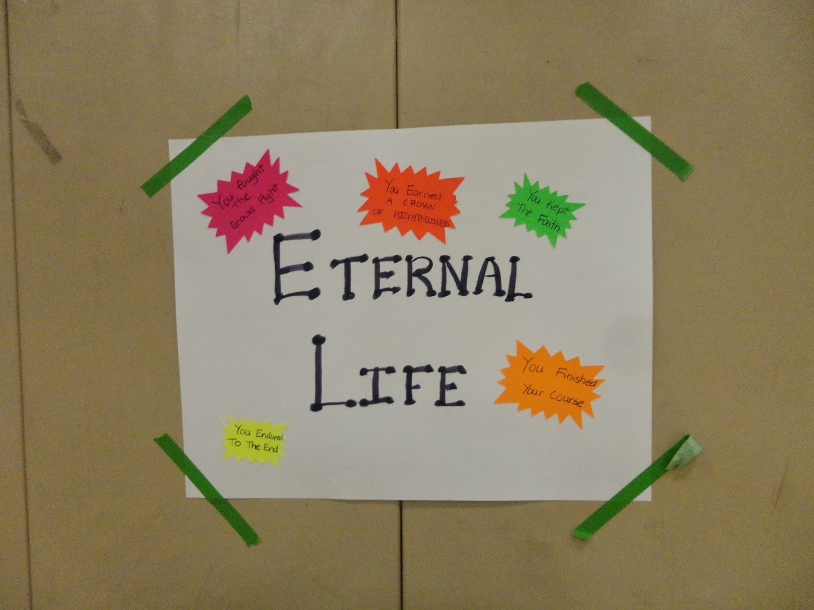 This was one of those days where I left class knowing that most of my students “got it” It was very effective and fun in the process. The advance work and preparation were worth every minute and, in reality, did not take as many minutes to set up as it may appear.After we completed the obstacle course activity, I had them gather around the “Eternal Life” sign at the end of the obstacle course. We discussed how it will feel to say to the Lord, I fought the good fight, I finished my course, I did my best.