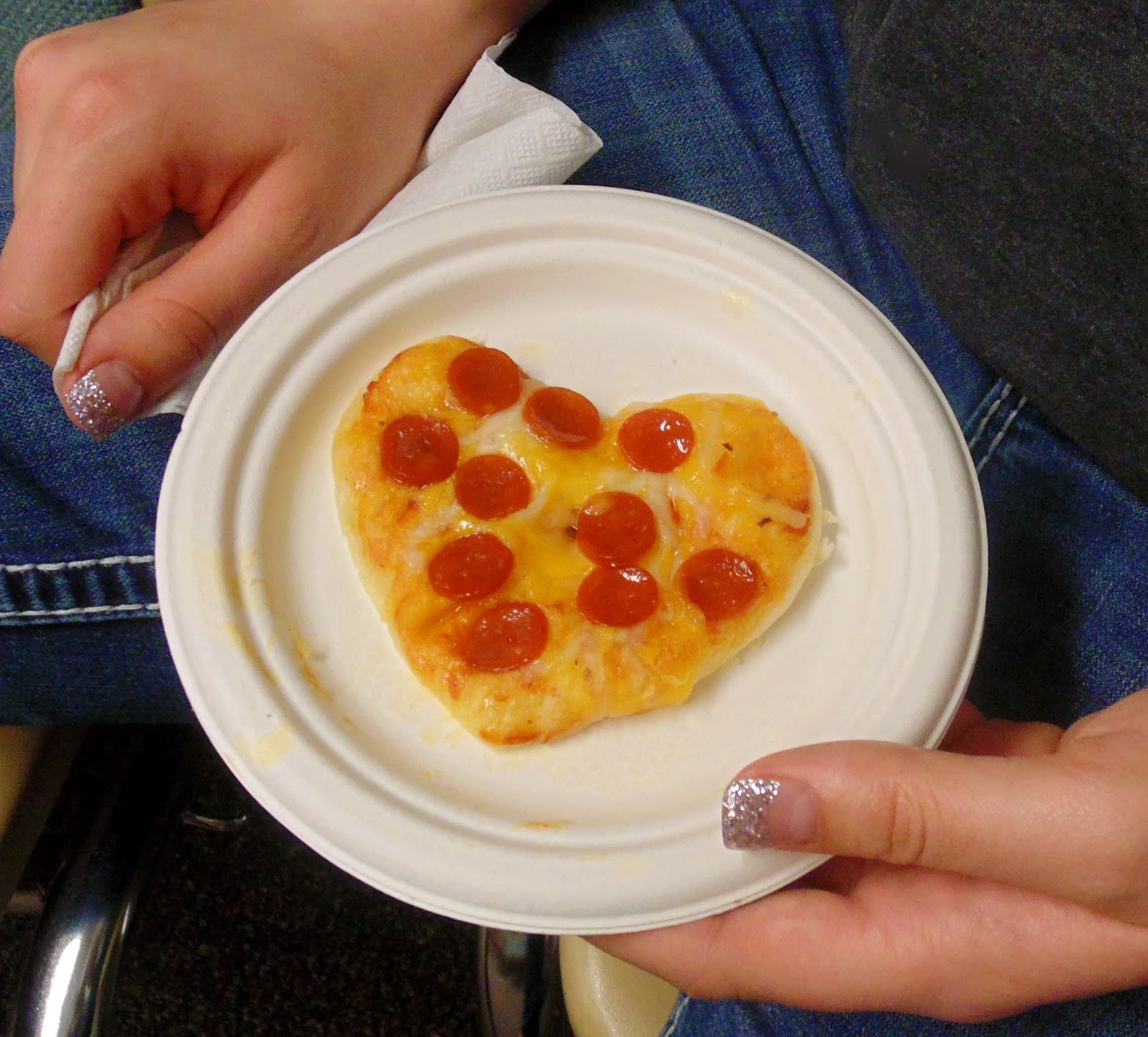 I considered teaching them to make homemade pizza dough, but we were expecting a pretty large group, so I simplified. I tried to find pre-made pizza crust and didn’t have any luck, so we ended up using crescent-roll dough (I used the Pillsbury “big & flaky” variety, because I worried that my 3-inch heart cookie cutter would be too large for the regular size crescent dough pieces). There are 8 pieces of dough in a can and the 3-inch size heart cookie cutter worked perfect with 1 heart per piece of dough. (I know what you’re thinking, I could have probably pieced and pinched dough pieces together and gotten more pieces out of the dough, but I was going for easy this time!) :)