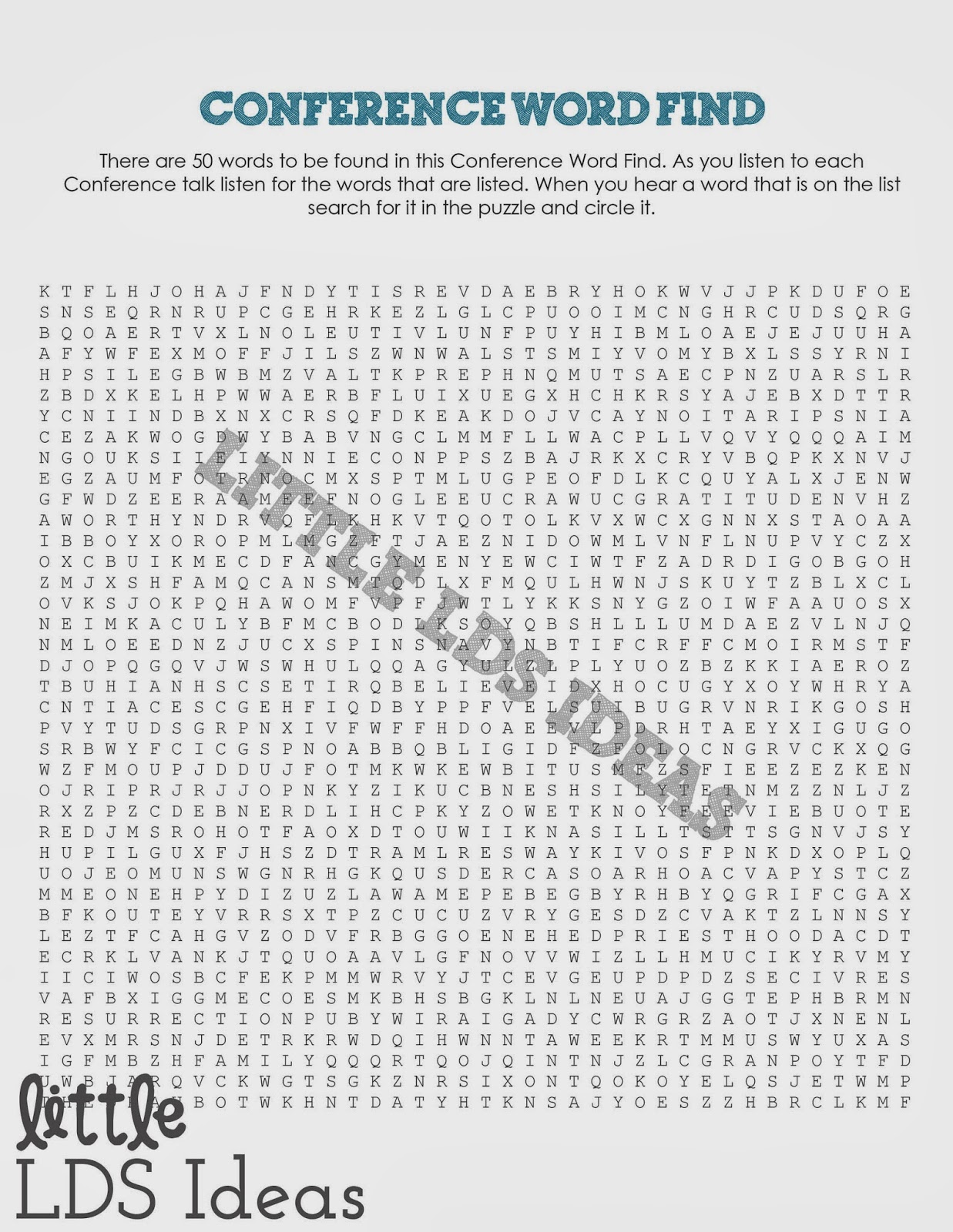 You can do the word searches 2 ways:1.) Have them find each of the words listed. 2.) Have them listen during Conference for the words listed. As they hear the words have them find it in the Word Search.At the end of Conference I will award points for each word that was found.