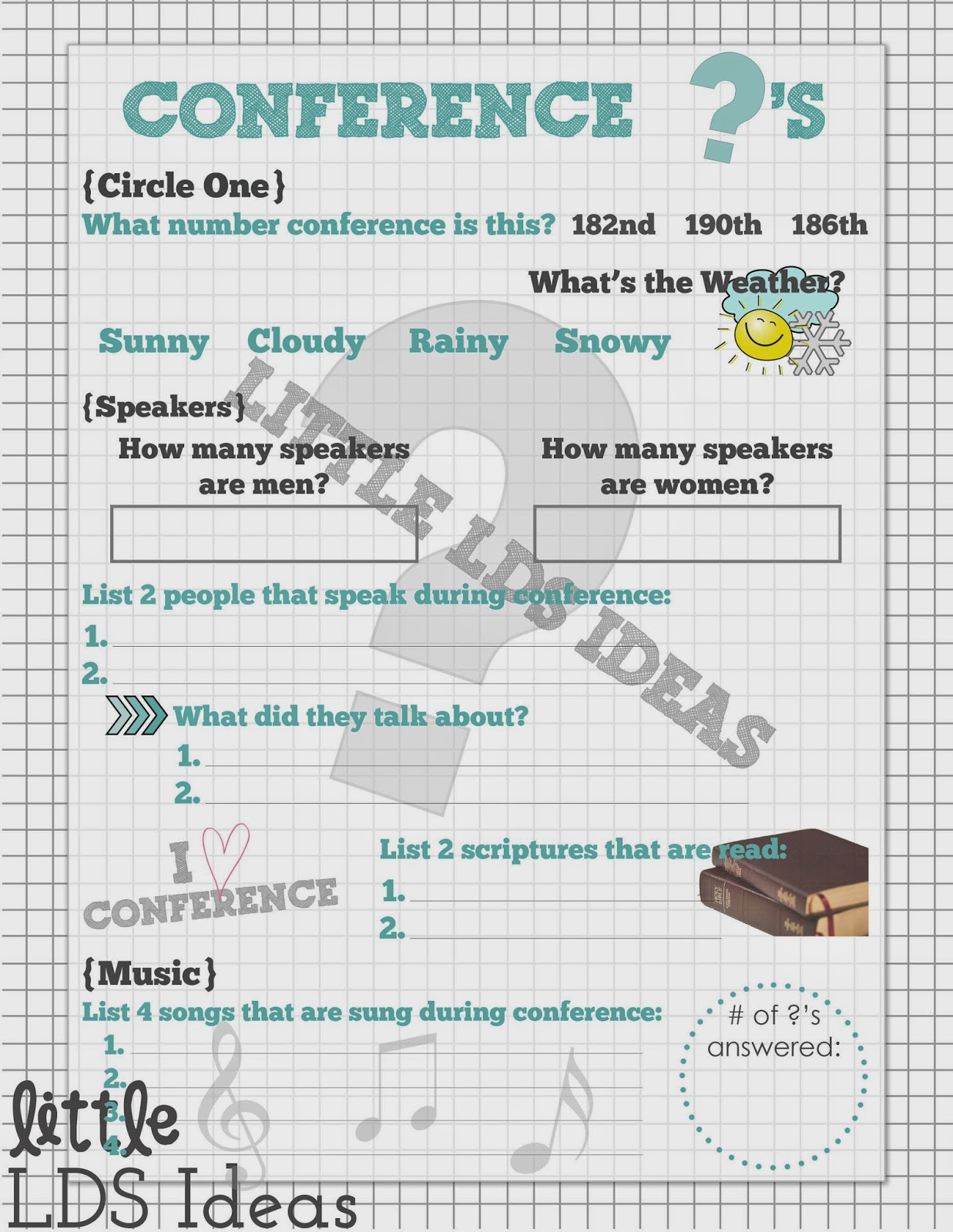 I also have some worksheets that they can use throughout conference. Here is what I came up with: