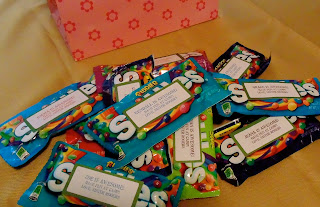 My husband is going up for Bishopric night tonight, so I made some treats for the young women. Last year I made cookies, but this year we have one girl with a serious gluten allergy. So, while I could have made two separate kinds of cookies, I thought I’d keep it simple this year. I bought a variety of Skittles (which are gluten-free) -one for each girl…