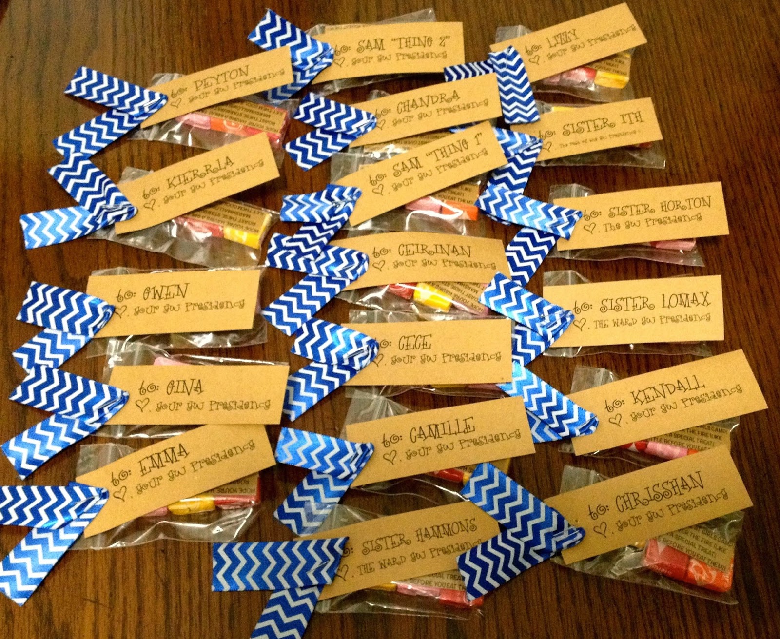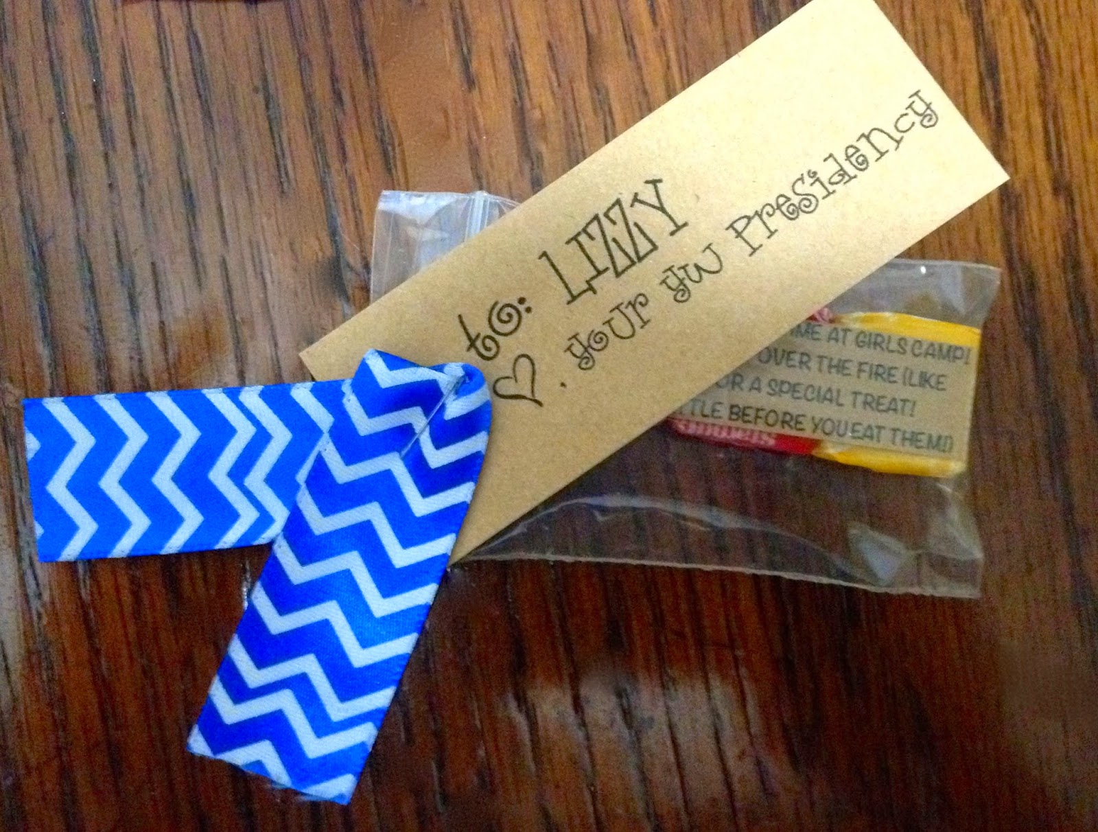 We usually send treats up with the Bishopric to Girls Camp on their Bishopric Night. The Bishopric also bring their own treats (usually ice cream sundaes) but I like to send along reinforcements from the YW Presidency as well. Most of us in the Presidency haven’t been able to go along because of work, health, or other obligations, so we like the girls to know that we’re thinking of them. I also make one for each YW Leader who is there from our ward (whether they are there in a Ward or Stake capacity)