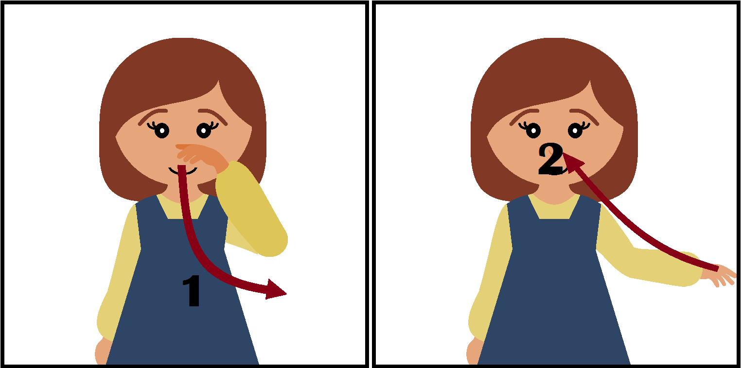 To direct a song with two beats per measure, the first beat is directed with the downward motion we just learned. Many choristers will curve this line slightly to the right, as shown, but it’s not necessary if that’s too hard. The second beat is directed by simply returning your hand to the beginning position in front of your face. (In every time signature, the last beat in a measure is directed by returning your hand to the beginning position.)