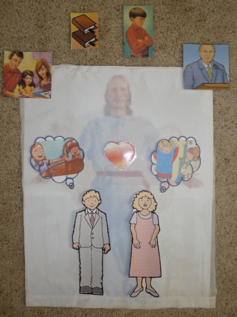 - For visuals on this verse I used items from OCD Primary Chorister to match the visuals I used in the other two verses (or the above posted pictures can be used instead and can be found here). I copied, pasted, and cropped the pictures containing the scriptures, the parents, the boy praying, and one picture each of the boy and the girl doing the right things. Copy and paste the pictures of the children choosing the right into these thought bubbles. You will also need enlarged individual pictures of the girl and boy that were used in the other verses. Print all the pictures and cut them out. Tape or glue the pictures of the individual boy and girl onto the bottom of the fabric. Put a magnet on the back of the other pictures of the fabric.
