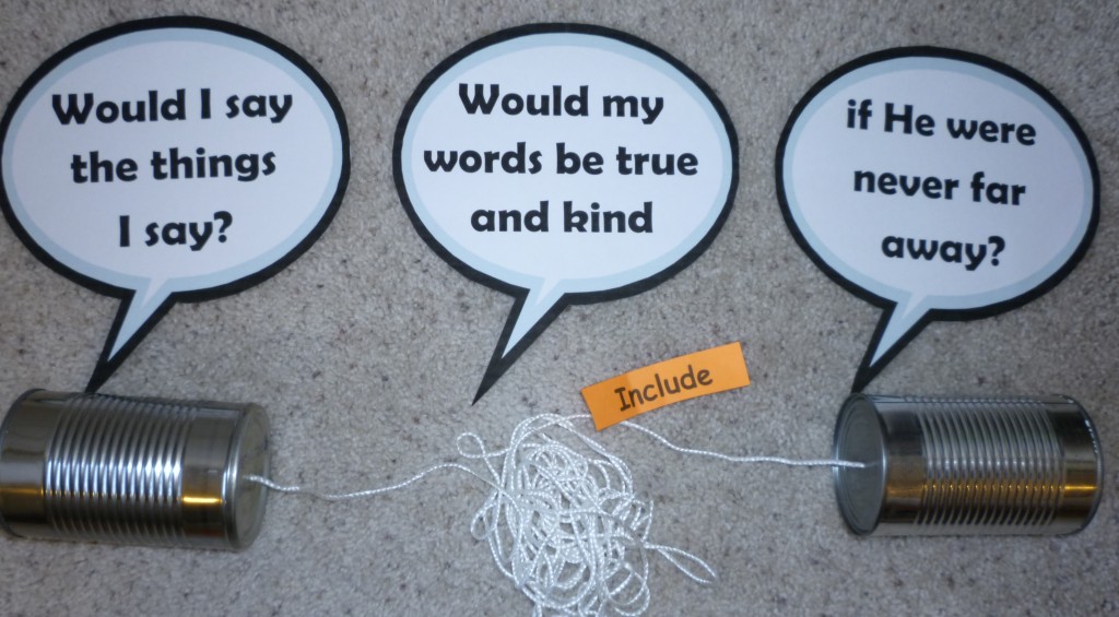 Remind the children that the first verse was about the things we do. Explain that the second verse is about the things we say. Show the first word bubble and explain that word bubbles are used as visual aids to help remind them that the verse is about the things we say.