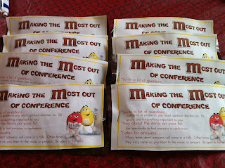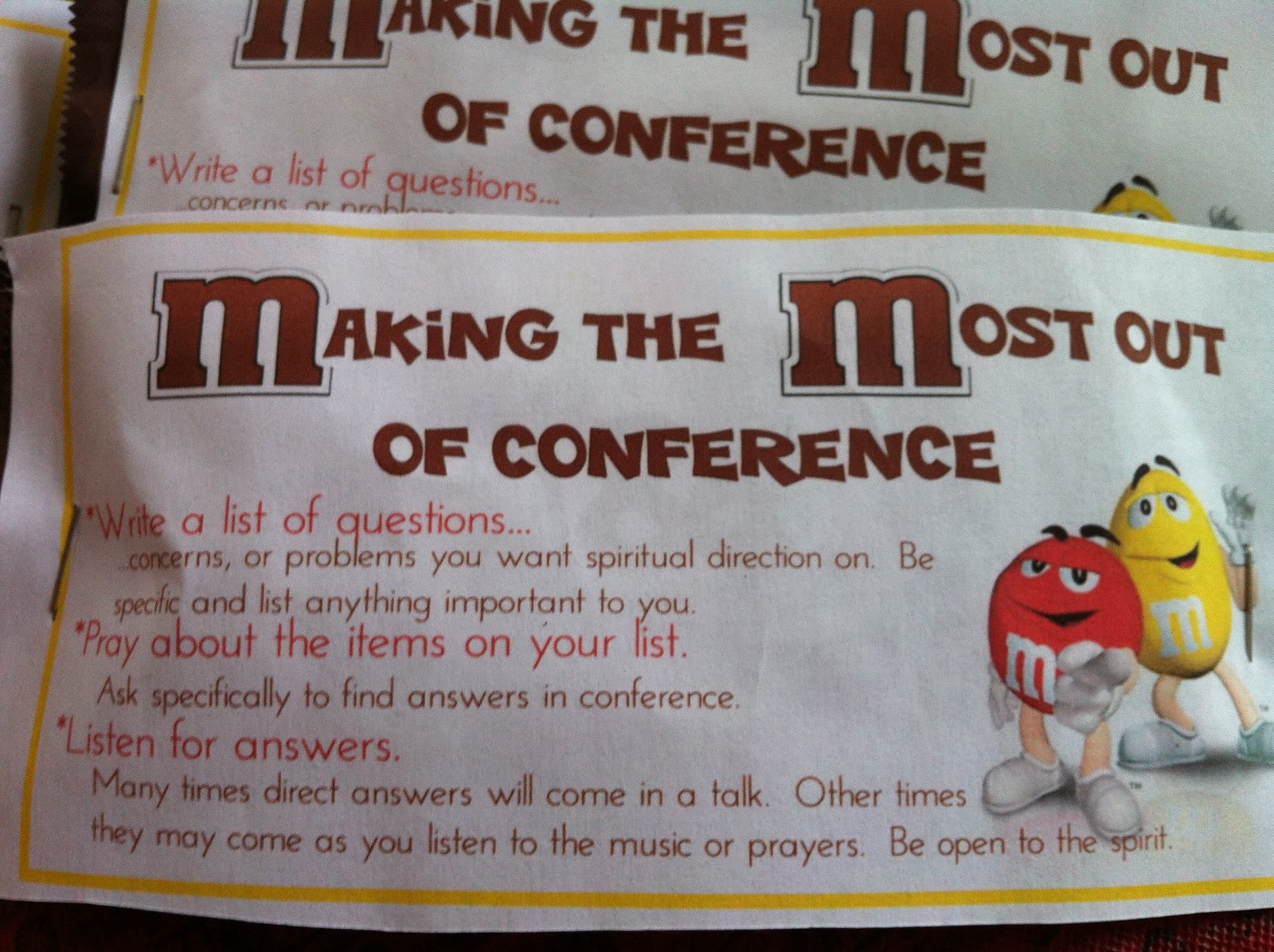 This idea is all over the internet. I think I originally saw it on Sugardoodle.net and it was originally from Marci Coombs.Any how, I gave each of my students a bag of General Conference M&M’s this morning. I challenged them to open the bag only after they have written down at least one question they want answered during General Conference this weekend. I have spent a lot of time teaching them how to prepare their hearts and minds for General Conference as well as teaching them how to take and use their notes. I am excited to hear their reports next week. I am just plain excited for General Conference!
