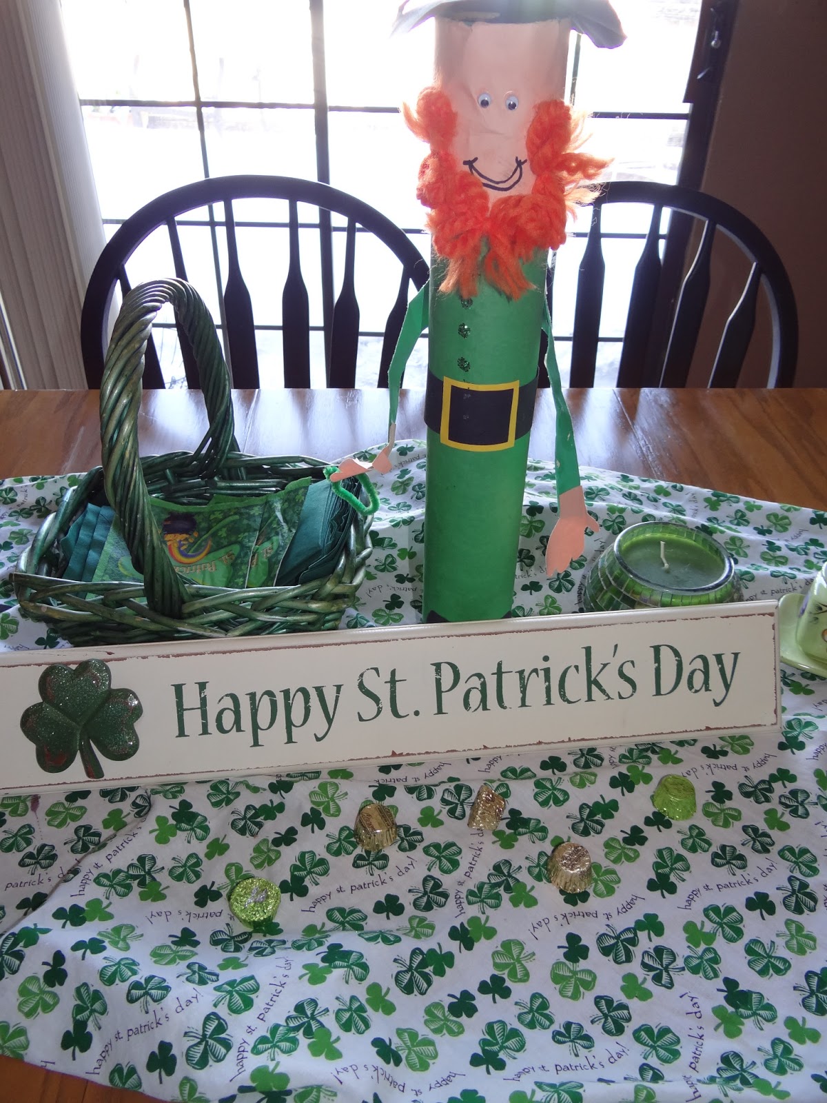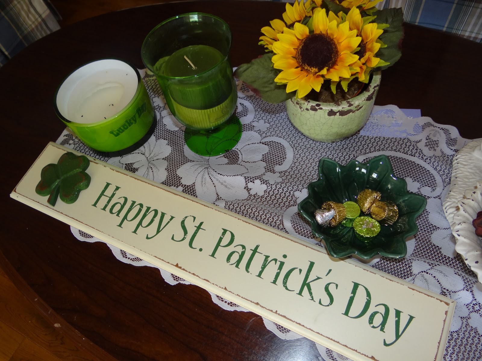 I don’t have very many decorations for it but I always do at least my entry table and my dining room table in honor of my mother and her love of St. Patrick’s Day. I also decorate my classroom in Shamrocks, leprechauns and GREEN, glittery stuff and of course GOLD wrapped chocolates!