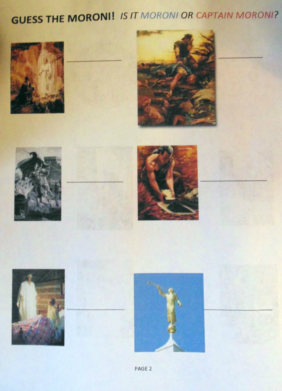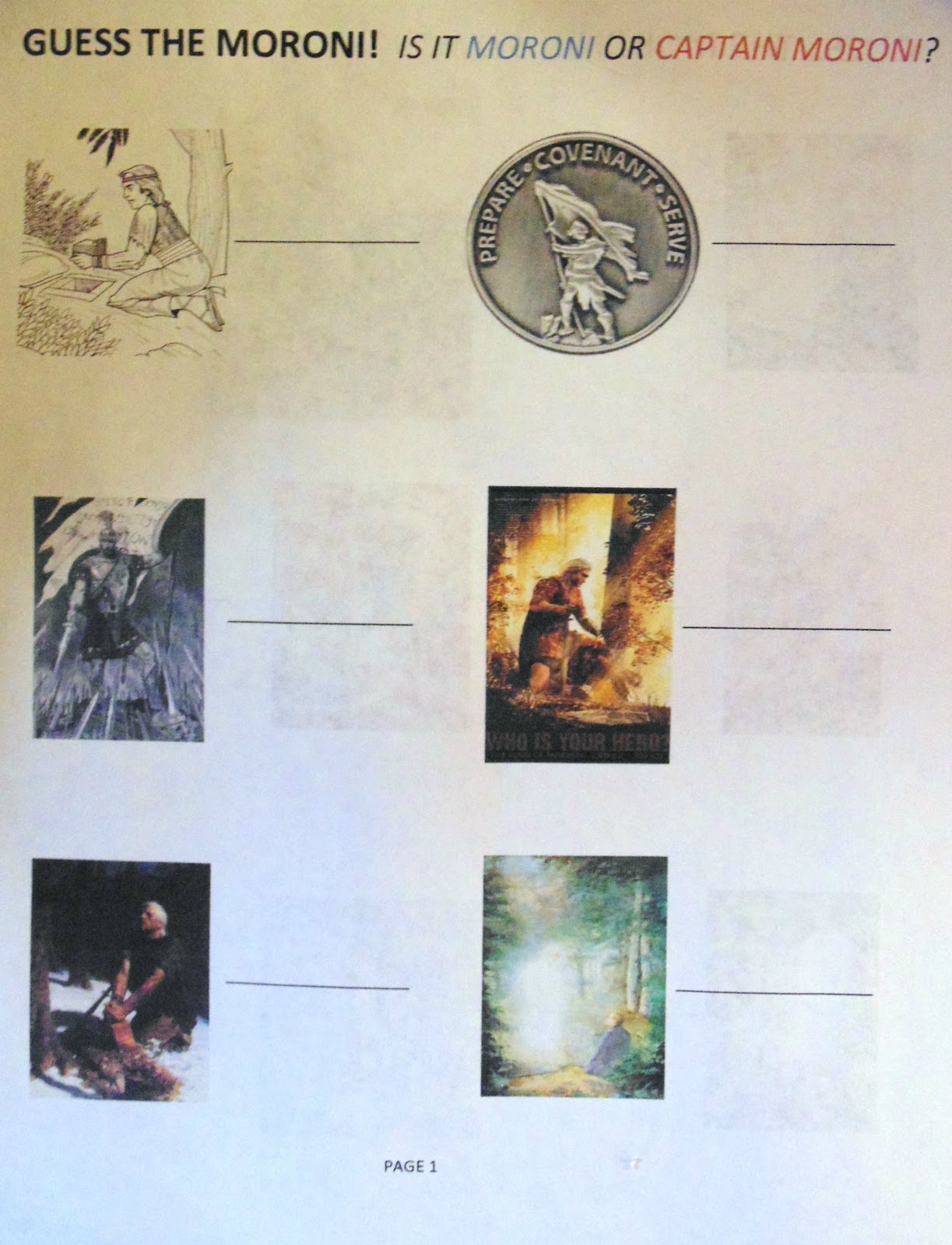 Here are some photos I took of the worksheets I made to give you an idea of what I did, but it is easy to make your own by searching for “Moroni” images on Google. Be ready to defend your answers, because even though this might seem pretty cut and dry, there might be some disagreement