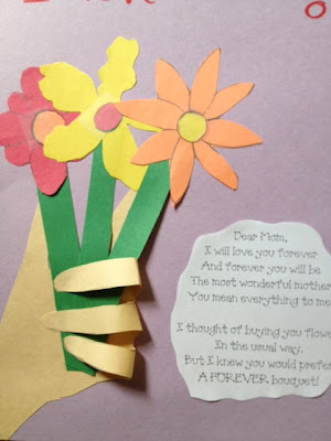 They made us sawdust molded handprints holding silk flowers. We took pictures together. And I remember crying when they sang the Mr. Rogers song “I Like Your Eyes”. They sang a bunch more numbers but that’s the one I remember crying on. At Mrs. Lirettes blog she shows a picture of a flower arrangement card I got from my little boys. They did the exact same card in Mrs. Seaton’s class. Maybe making little cards would be fun!This one was from my little Daniel Moss when he was only 6.