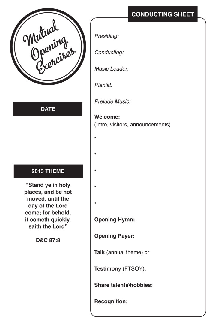 In an effort to have better quality mutual night opening exercises, I’ve made another agenda for our youth to use. The half-sheets of paper fit nicely on mini clip boards (6 x 9″), and I’m considering giving the young man or young woman who is conducting for the month a clipboard with 4 or 5 agendas. They can make assignments for the whole month, fill in the sheets, then hang the clipboard on a bulletin board at church so youth can see and be reminded of what’s coming up.