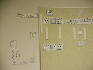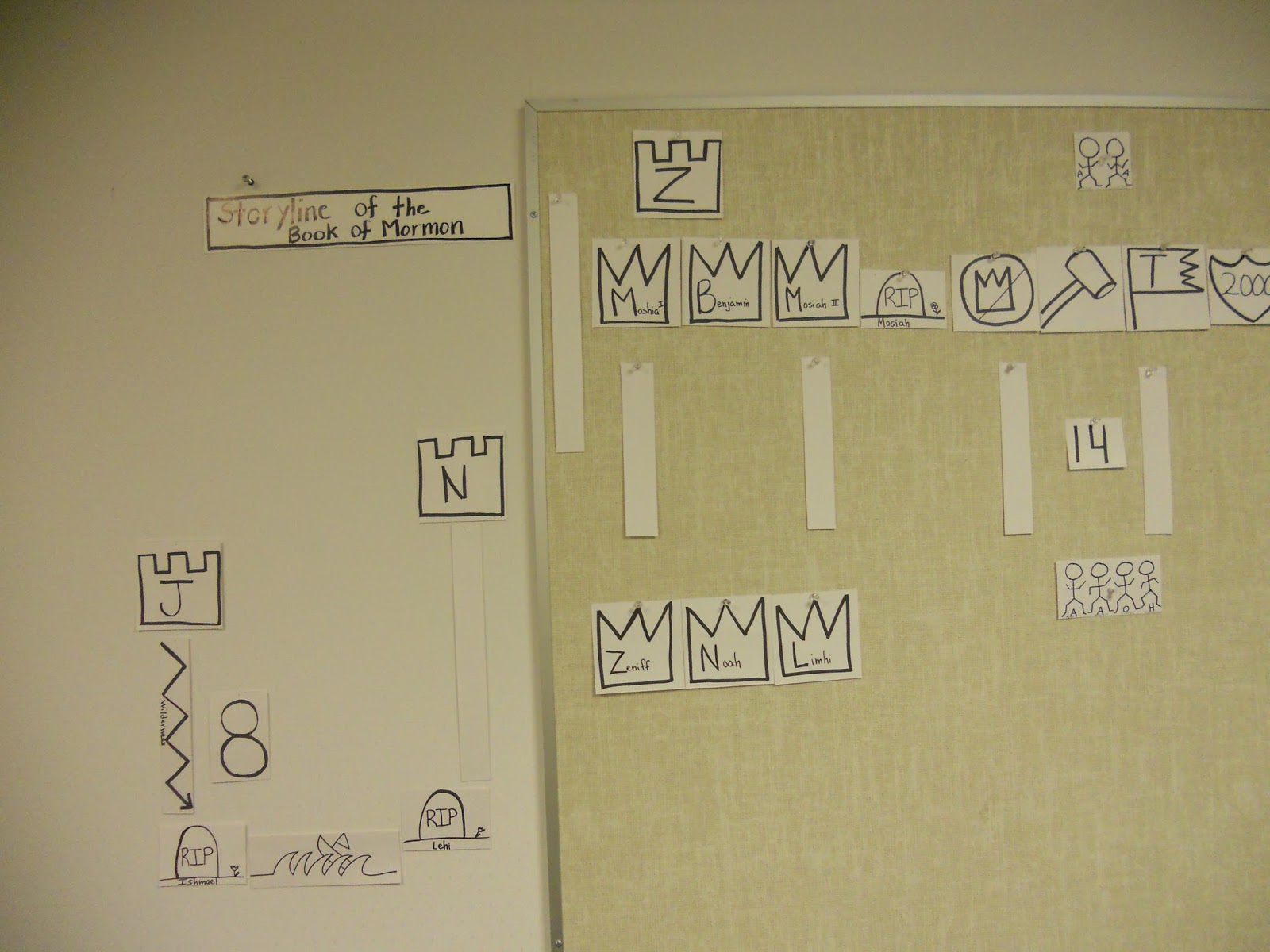 The “Z” at the top of the timeline stands for Zarahemla. There are 3 kings who reside in Zarahemla (Mosiah I, Benjamin, and Mosiah II), and 3 kings who end up in the land of Nephi (Zeniff, Noah, and Limhi). The kings are represented by the crowns.) Zeniff’s people traveled to the land of Nephi and ended up being in bondage to the Lamanites until Limhi’s people were brought back to Zarahemla, thus the “squiggly lines”.