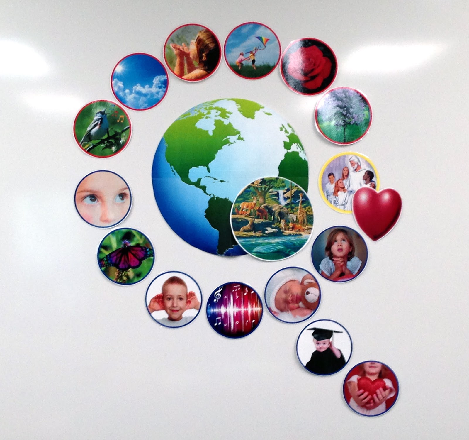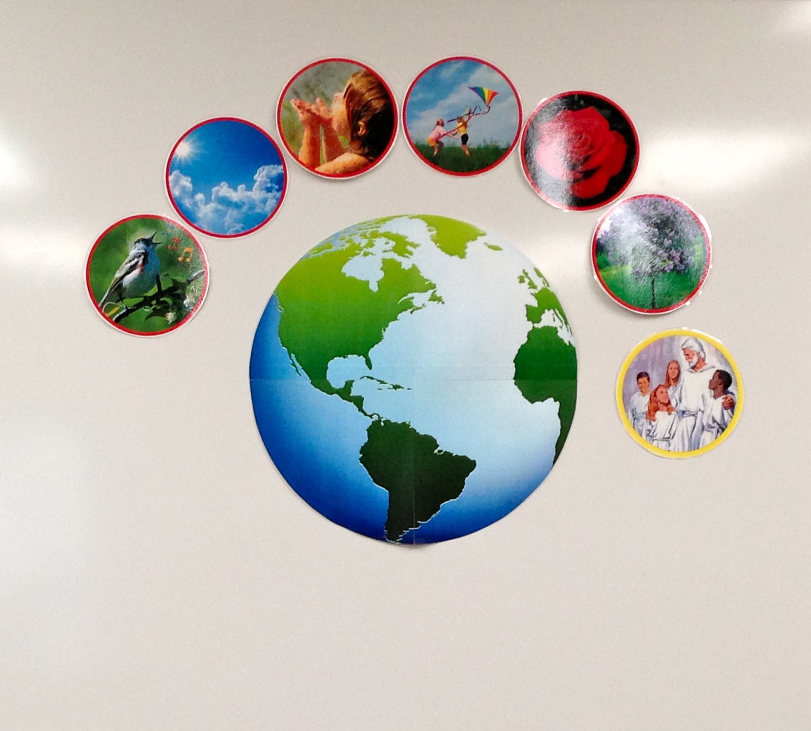 First off, the visual I made has no text because this is a fairly easy song to teach using pictures and/or objects. As you can see by the picture on the right. I visualized this song using pictures that represent the different parts of the song displayed around a BIG WORLD with the first verse surrounding the top half of the world and the second verse around the bottom half of the world while sharing the world for both of the verses as well as the images where both verses meet on the right hand side of the world (Heavenly Father and heart). The first verse is color-coded with a red border and the second verse with a blue border.