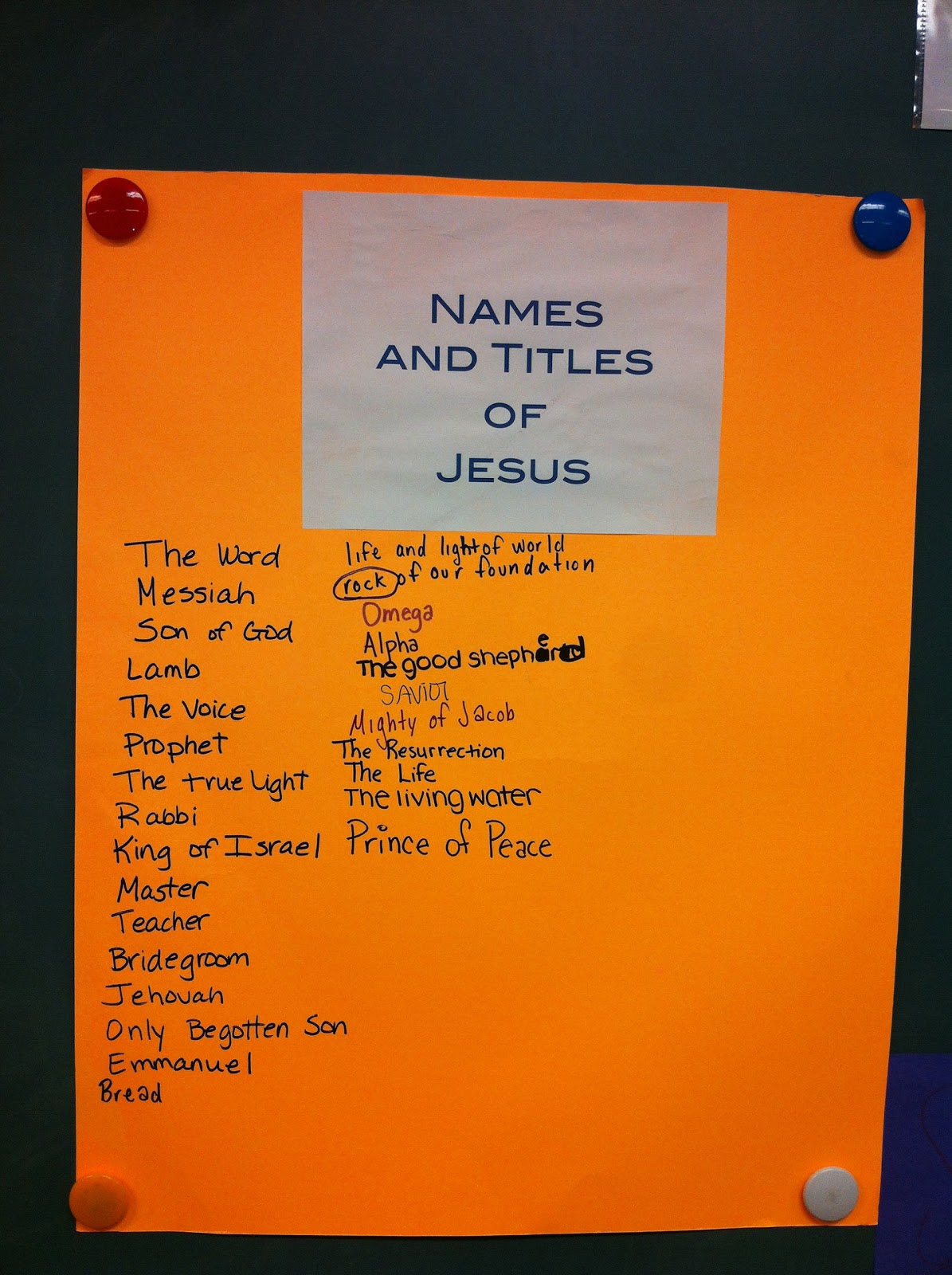 As we are studying the book of John, I challenged my students to be explorers and discover all the different names and titles of Jesus. Daily, they come in to class and add to our growing list.