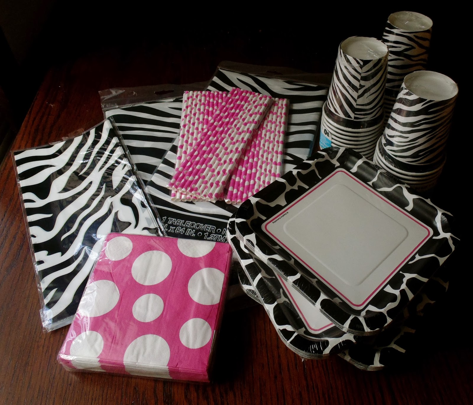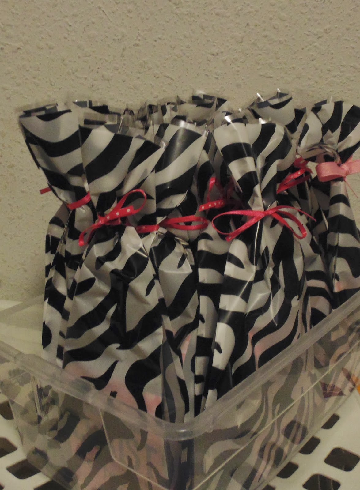DECORATIONS:I found these paper products on sale, and I thought the black/white/pink and animal print would be perfect for the occasion! We also found coordinating balloons and printed a “New Beginnings” banner for the wall (see last photo below)GOODIE BAGS: