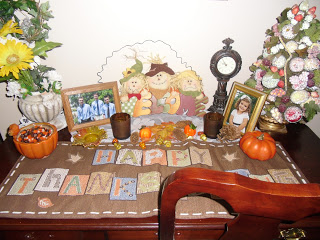 My grandkids’ table…I would definitely use scarecrows and cornucopia this week, and maybe save the Pilgrims and Indians for next week, closer to the Thanksgiving holiday.
