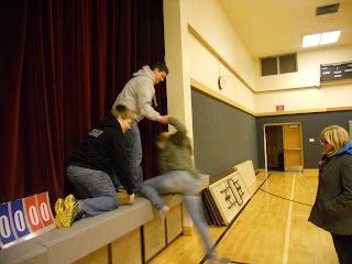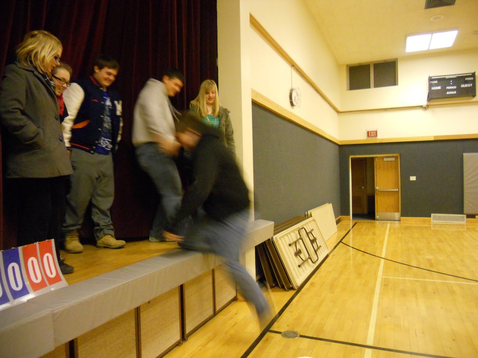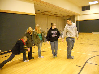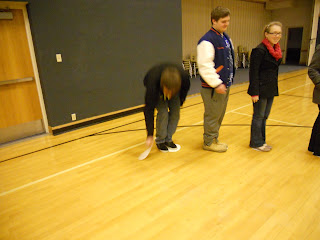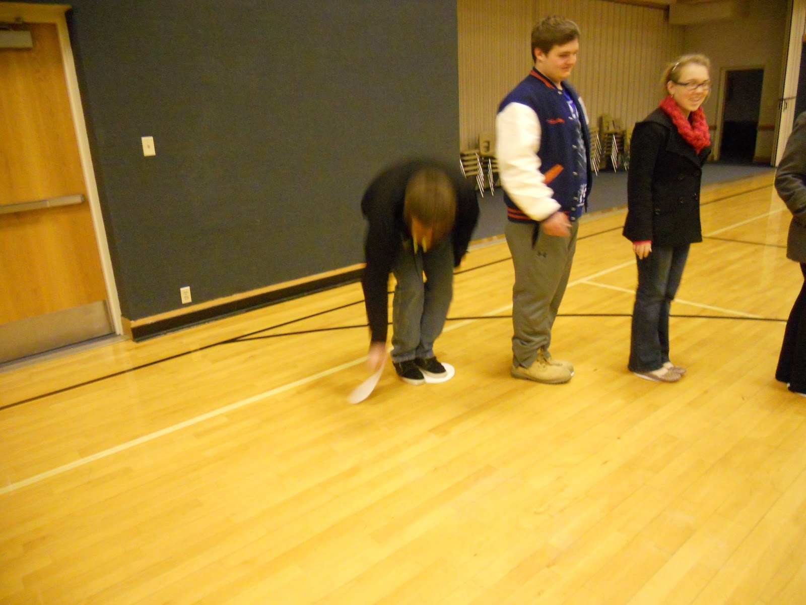The line started at the back of the gym and the goal was to make it to the stage without stepping off the paper plates. The end person had to pick up his and pass it forward.