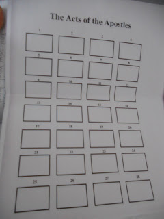 Today we did an overview of the Book of Acts. Using the graph below, they were to read the chapter headings. Then draw of write a keyword about that chapter in the corresponding rectangle.