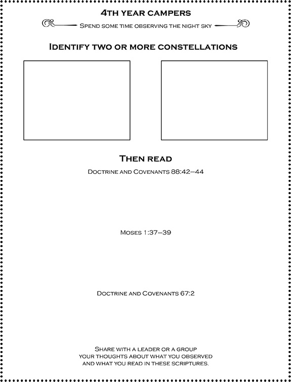 One of the certification requirements for young women attending Girls Camp as 4th years is to observe the night sky, identify 2 or more constellations, and read scriptures, then reflect. Now is a great time to get this done, while it gets dark earlier and you can try and catch a nice, clear night sky. I just put together this printable to help our 4th years get this done. I’m also going to print this out, which shows some constellations from the winter/early spring sky, along with some facts about each one. A great app to help locate the constellations in the sky is this one.