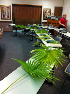 There was also a palm branch at the seat of each student and I discussed how in many faiths, on Palm Sunday, palms are distributed to the members and they make crosses or crowns representing the crown of thorns placed on Jesus as he was on the cross. I printed out the instructions for making a cross from palm leaves and as I taught, I welcomed them to try their hand at braiding the palm leaves, making a cross, or just using a leaf as a book mark.