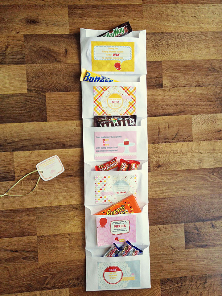 We will be recognizing two of our young women for having completed the Personal Progress program and received their Young Womanhood Recognition award. They both received their medallions a couple months ago, but I wanted to do something special for them at our New Beginnings – so made this fun collapsable candy gram to present to them.