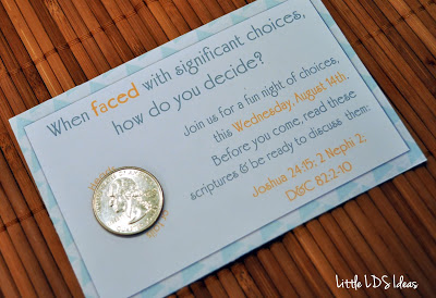 I handed each girl an invitation and explained that we would be focusing on choices for our next activity. I told them to read the scriptures that were listed on the invite & be ready to discuss them.